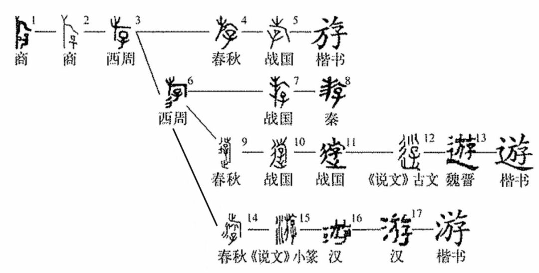 古文中,“游”与“遊”音同义近。二者的差别在于:“游”是在水面移动,“遊”是关于陆地上活动的。但在实际运用中,表示陆地行走之义时,游、遊二字通用。异体字整理时,将“遊”字合并入“游”,今以“游”为其正体。