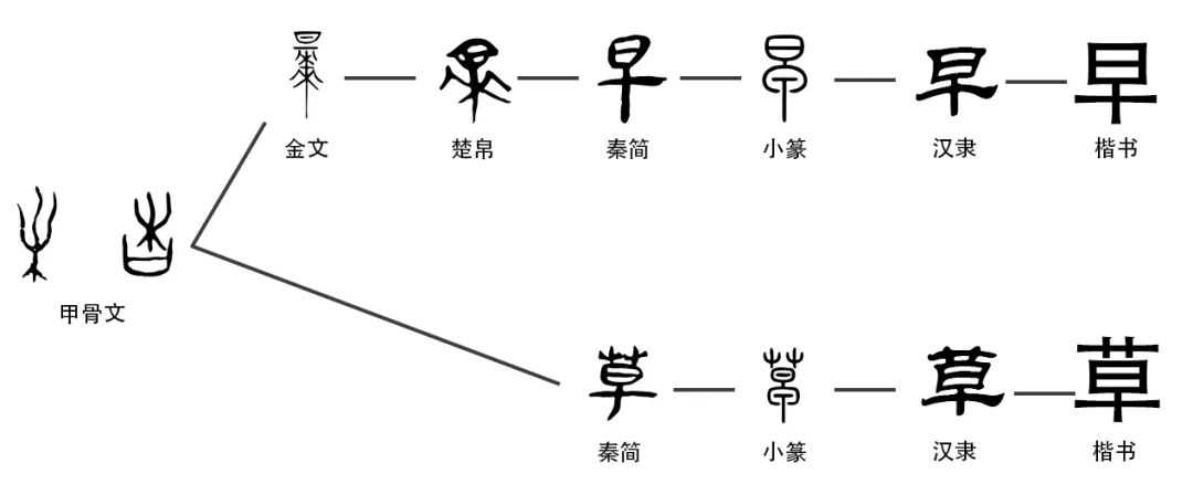 “早”zǎo,初为象形字。“早”字甲骨文的写法均是从屮从口,版本很多。但到战国晚期却只流传下来一种,且字形发生极大变化。秦国灭楚前,楚帛的“早”字与战国晚期的“早”字同源,基本构成为从艸(从日或从甲)。秦简的“早”字从日从甲。至此,“早”字定型,小篆承续秦简,楷书简化为从日从‘十’即为今天我们所看到的“早”,异体字“