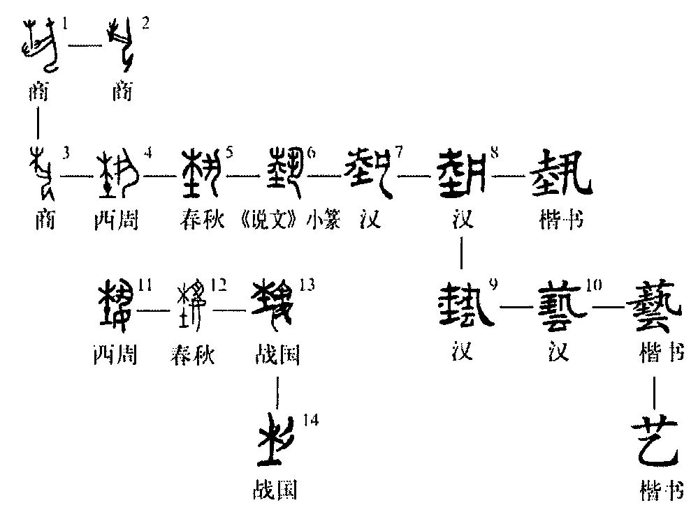 “艺”yì,初为象形字,“藝”的简体字。“艺”字最初写作“埶”(yì),商代甲骨文(图2、3)、金文(图1)的“埶”字,像一个人双手捧着一棵树苗的样子,本义指种植。西周金文中的“埶”字(图4),由其甲骨文字形发展而来:人的样子得到了细化,但是人的双手加上一竖;苗木下部增添了个“土”字,表示苗木是要种在土壤中的。有一些金文(图11、12)或战国楚简(图13)人形下部是“女”字,当是由“止(趾)”形上移讹变而成。图14是楚简中的简化字。发展至秦代的小篆(图6)阶段,“埶”字的写法发生了较大的变化,变成了左右结构:右边的人字形与独体“丮”(读作jǐ,意为握持)字的小篆字形一致;左边变成了“坴”,上边仍是一棵苗木,有叶茎和根,但由于小篆追求圆滑等特点,这些看起来都不是那么像实物。后来,由于“埶”字的字形既不能很直观地表达出“苗木”之义,也没法显示读音,所以人们在它的基础上进行了再创:因禾苗是草属,人们在“埶”上面加上了表示“草”之义的“艸”部;同时,又在其下加(云,说,传授),由此诞生了“藝”字。强调在古代园丁的经验靠一代代口口相传。对早期的农业社会来说,种植是极其重要的技能,因此“艺”代表“技”。隶书(图7-10)与楷体中的“藝”字,皆由此发展而来。再后来,由于“藝”字的字形过于复杂,所以人们又将其简化为“艺”,“艺”是形声字,“艸”为形旁,表示与花草有关,“乙”为声旁,表读音。