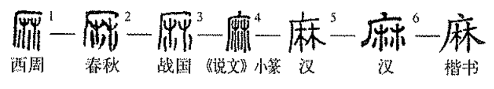 《六书正譌》:从林,音派,麻片也。从广,人在屋下治麻之意。俗作麻,从木,非。
