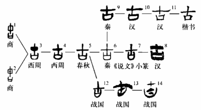 “古”,在甲骨文、西周早期金文中都是“盾”的象形,下面加上区别符号“口”构成指事字,是“坚固”之“固”的本字。“盾”的特点是“固”,所以能从中分化出“古(固)”。这和“弓”的特点是“强”,下加区别符号“口”构成“强"的本字“宫”是同一道理。自西周中晚期盾形线条化成“十”之后,形体基本稳固,战国文字中虽然有“口”中加点、线的异体,但在以小篆统一的文字和秦汉古隶的演变中都逐渐消失了。许慎所说的“从十、口,识前言者也”是据后代的字形说后代的字义。如果只就小篆等后起字形和“古”的常用义“时间久远”而言,是合理的,经过十人之口传下来的故事,正是时间久远。