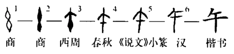 “午”wǔ,象形字。在字形上,甲骨文中的“午”字与“糸”(sī)相似,像两头粗中间细的杵棒,以增加在臼(jiù)中舂米的摩擦力。造字本义:舂米棒。有的甲骨文将横结写成实心圆点,以区别于“糸”。金文有所变形,可能由于兵器杵的出现。有的隶书严重变形。当“午”的“舂杵”本义消失后,篆文再加“木”另造“杵”代替。在字义上,“午”字的本义是“舂杵”,引申指“抵触,违逆”,借作“五”指“纵横相交”,又借作“十二地支的第七位,与天干搭配来纪年、月、日、时”,还可以表示“十二生肖中的‘马’”等。