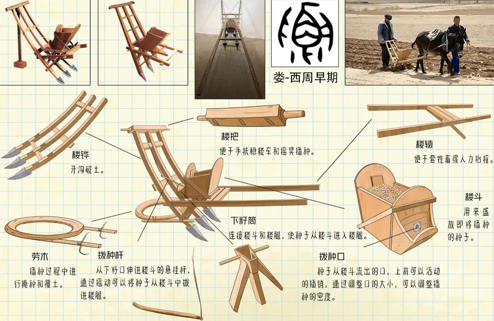 《正字通》下种具。一曰耧车,状如三足犂,中置耧斗,藏种以牛驾之,一人执耧,且行且摇,种乃随下。崔实云:汉赵过敎民耕殖,其法,三犂共一牛,一人将之,下种,挽耧皆取备焉。日种一顷。按此卽耧车也。见齐民要术。