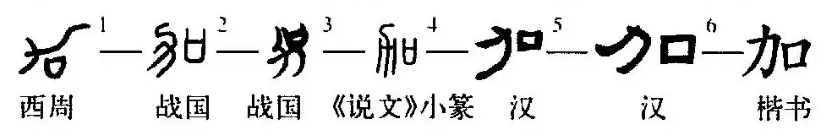 “加”,从力,从囗。造字本义:一种叫连枷的打谷农具。“加”字因其由杖与囗相连,引申为“连接、增加”义,本义由孽乳字“枷”继承,后因“枷”衍生出其他义,由孽乳字“耞”继承。