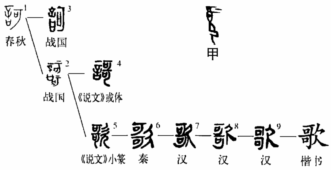 “歌”字常见于西周文献,但古文字资料中最早见于春秋时代。在金文中,“歌”写作图1(诃),左部是“言”,作形旁,表示这个字的本义与言语有关;右部的“可”,为赞同、许可,于此作为不示义的声符,表示音读。一说,“可”有唱歌之义,于此作表义的声旁。《说文解字》小篆之或体承袭战国古文字诃字的形体。形旁仍然为言,声旁改为“哥”。“哥”作二可相叠,有人认为更突出表示男女对唱情歌。《说文》曰:“哥,声也。从二可。古文以为謌字。”由此可知,“哥”是“謌”的本字。