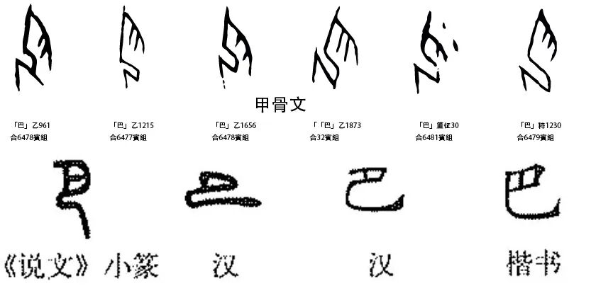“巴”bā,象形字。像人跪坐伸出双臂席地趴卧,造字本义:人体前倾。引申为挨,靠近;手臂及五指紧贴地面,其形又引申为农具“杷”。