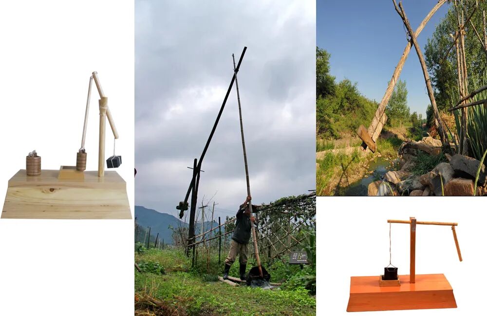 《庄子·天地》(战国中后期)中有一段非常形象的描述:“子贡南游于楚,反于晋,过汉阴,见一丈人方将为圃畦(pǔ qí,种田),凿隧而入井,抱瓮而出灌,搰搰(hú)然用力甚多而见功寡。子贡曰:‘有械于此,一日浸百洼,用力甚寡而见功多,夫子不欲乎?’为圃者仰而视之曰:‘奈何?’曰:‘凿木为机,后重前轻,絜(jié)水若抽,数如洪汤,其名曰槔。’”《庄子·天运》也说:“师金曰:‘且子独不见夫桔槔者乎?引之则俯,舍之则仰。’”成书于西汉的《说苑·反质》也记载了一段与桔槔有关的故事:“卫有五丈夫,俱负缸而入井灌韭,终日一区。邓析过,下车为教之,曰‘为机重其后,轻其前,名曰桥,终日灌韭,百区不倦。’”这里说的是“桥”。“桥”是什么?《淮南子·主术训》(西汉)说:“桥直立而不动, 俛俛俛俛俛(fǔ,同俯)仰取制焉。”高诱注:“桥,桔槔上衡也。”《礼记·曲礼上》(西汉):“奉席如桥衡。”郑玄注:“桥,井上楔(xiē)槔也。”“楔”又作“