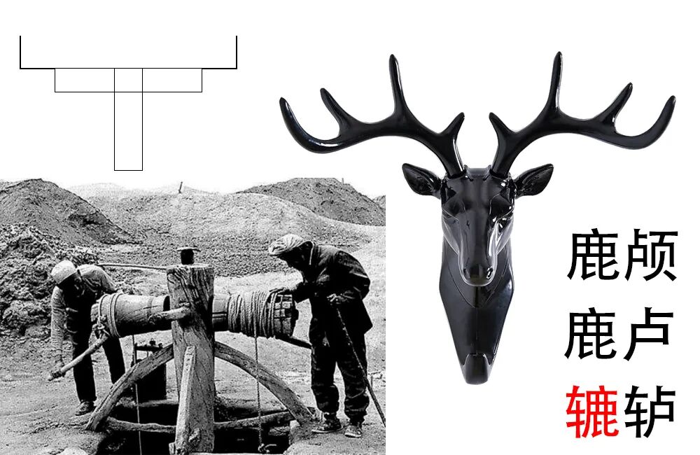 如今,我们所能看到的大多数辘轳,多为单柄,偶有双柄、四柄,而《仓颉篇》提到的椟栌即为第一张图所见到的辘轳,其形为鹿颅,双柄,三根辅木支撑的汲水农具。