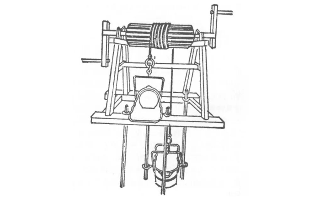 但历史文献中一直没有详细的文字记载辘轳的结构,最早提到“辘轳”结构的文献可能是《仓颉篇》(秦、汉),写为“椟栌”(dú lú),注解是“三辅举水具也”,但没有具体结构的介绍。直到元朝王祯在他的《王祯农书》中才有比较详细的描述。《王祯农书》说:“辘轳,缠绠(gěng)械也。《唐韵》作‘椟轳’,汲水木也。井上立架,置轴,贯以长毂,其顶嵌以曲木,人乃用手掉轳,缠绠于毂,引取汲器……”并且绘了一幅图。(下图)