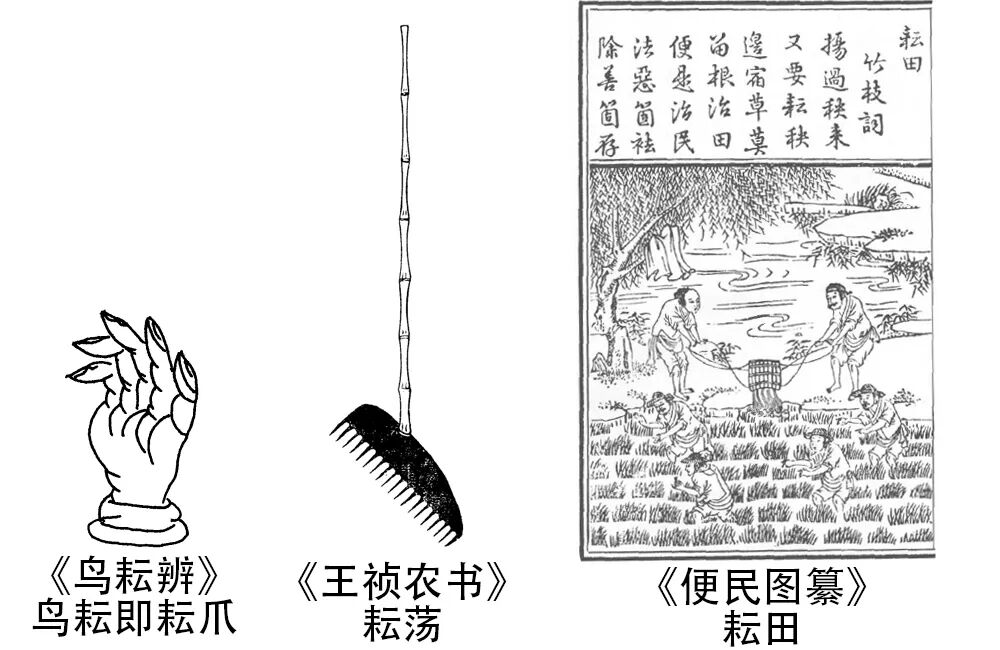 唐·陆龟蒙的《鸟耘辨》中提到了“鸟耘”,有人认为“鸟耘”即指“耘爪”。《王祯农书》对耘爪有详细介绍:“耘爪,耘水田器也,即古所谓鸟耘者。其器用竹管,随手指大小截之,长可逾寸,削去一边,状如爪甲。或好利坚者,以为之,穿于指上,乃用耘田,尤鸟之用爪也。陆龟蒙《鸟耘辨》谓:耘田去莠(yǒu,恶草的统称),举手务疾而畏晚;鸟之啄食务疾而畏夺。其法疾、畏,故日鸟耘。然尝观农人在田,伛偻伸缩,以手耘其草泥,无异鸟足之爬抉,岂非鸟耘者也。”为此王祯深为感慨地写道:“惟农有鸟耘,爪田乃去莠,划竹贯十指,耨nòu禾牵两肘……羡彼城府人,安居手长袖。”