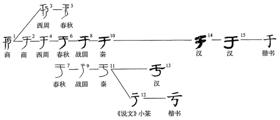 《说文》:亏,於也。象气之舒。从丂从一。一者,其气平之也。今作于。