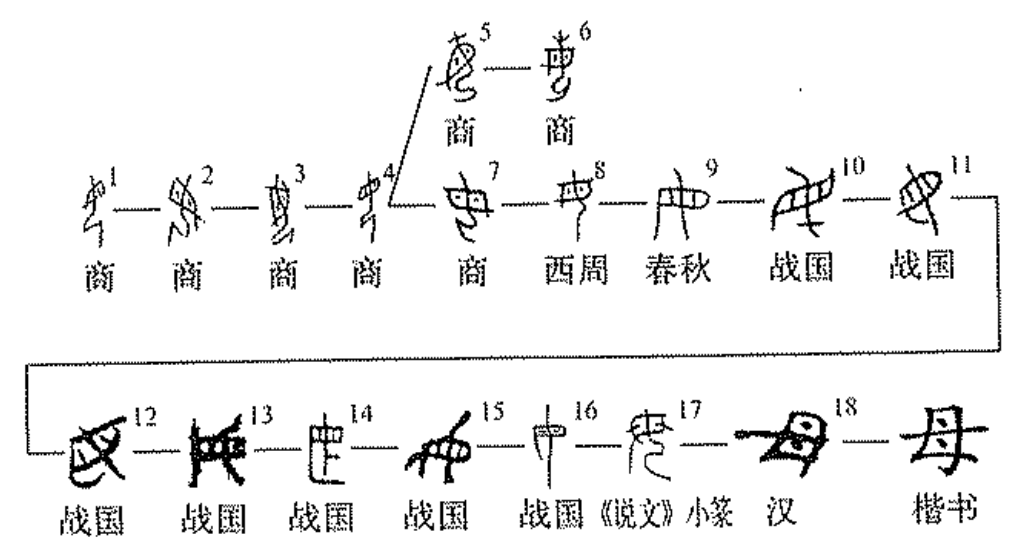《苍颉篇》:其中有两点,象人乳形。竖通者即为毋。