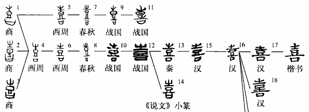 也有人对“喜”的结构作了不同的分析,他们认为“喜”字上部分是鼓的形状,下边部分是放置鼓的基座的代形,以表示有了喜庆事,而擂鼓奏乐庆贺。