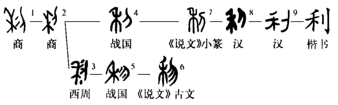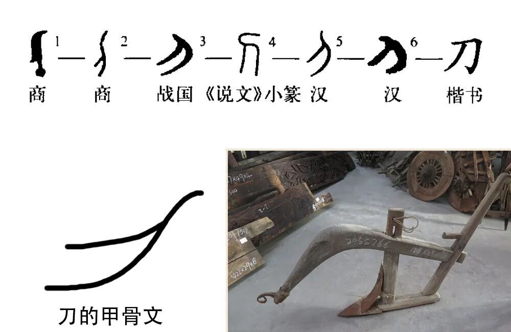 “利”是由两个象形字“禾”和“刀”构成。“利”,从禾从刀,如果理解成以刀断禾,似乎合情合理,但“刀”的甲骨文为上图所示,从古至今的刀都不是这个形,或者勉强可以做成这样的形的那不是叉吗?更为贴切的“刀”应该如“刂”一样,起码长的一竖可以表示刀柄,短的一竖可以表示刀刃。而原始的“犁”的形状恰恰和“刀”的甲骨文以及后来的主流‘刀’字几乎一样,原始犁是由一根插入土中的部分和一根牵引的部分组成,在牛耕之前,大概需要人来牵引吧。再来看原始犁与刀的功能,插入土中的部分最好尖锐些,这样犁地效率高点吧,也就是说犁可以有刃,能分开地垄,基本上‘刀’的功能都有了。最后看看‘刀’字旁的常用且笔画少的汉字,“召、分、初、劈、剪”,“召”,唤人(干农活);“初”(