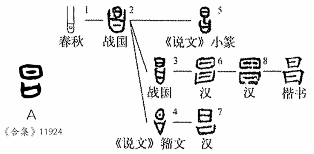 “昌”,会意字。此字始见于商代甲骨文。“昌”字,甲骨文作图A,与《说文解字》籀文同(图7),上部从日,下部从口会意。它的本义应是日出时叫人起床的声音,也就是“唱”字的原型。裘锡圭先生说:“‘唱’最初很可能指日出时呼唤大家起身干事的叫声。这种叫声大概多数有一定的调子,是歌唱的一个源头。”后来“口”字变为“曰”。囗是话发声的器官,曰表示发出有声的言语,二者有共性,故篆文将口变为曰作昌,或者盖因“昌言”一词所致,《说文》训昌为“美言”,常本“昌言”。但昌只有美好义,“美言”是增义为训。