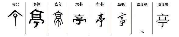 “亭”tíng,象形字。金文“亭”像一座“享”形建筑,但有顶无墙,中间由一根锥形构件承重。造字本义:沿途可供休憩的设施。