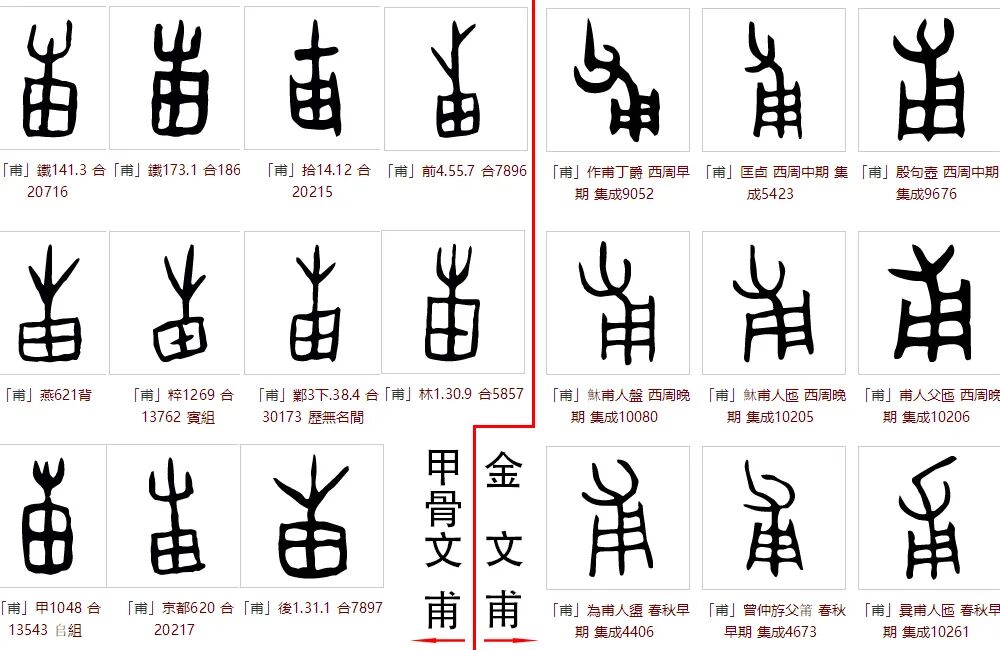 “甫”fǔ,本为象意字。商朝时期的“甫”从牛从田,表义田中以牛耕田。但到了西周时期,出现了一个奇怪的版本,西周早期作甫丁爵中的“甫”,从父从凡,自此至战国末期,其间虽有些矫正,但“甫”的字义已经偏离造字者最初的想法。自西周开始,讹变出“父”的含义,后世沿用至今。由“甫”组成的字,字义皆以“用”的错误含义而造,目前未发现“甫”字旁的甲骨文,此后不再编撰“甫”字旁的字。