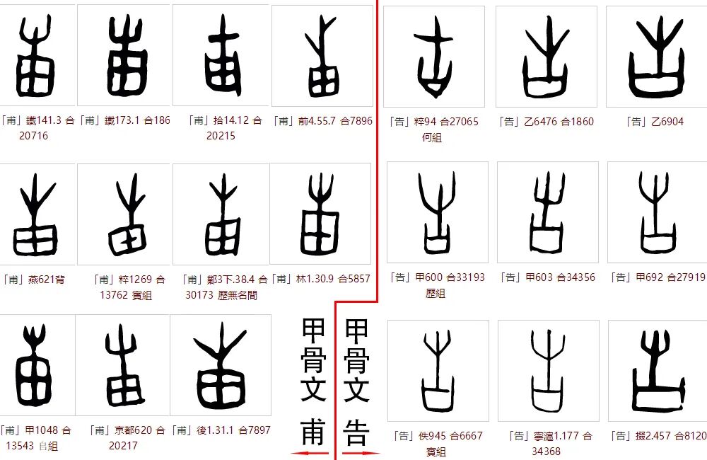 最后再说说为什么是从牛从田。汉字中,以牛做偏旁上下结构的汉字只有“告”。“甫”的甲骨文上部构件也形似屮(草),但“田里的草”没有实在意义,加之多数构件都与“牛”在“告”中的写法一致,因此,得出了此观点。