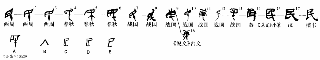 “民”,指事字。甲骨文写作图A,上部像一只左眼,下部像针刺一类尖利的东西刺着眼睛,致使一目而盲,疑即“盲”的本字。西周金文(图1-3)字形与甲骨文大致相同,部分字形眼目之中已没有瞳孔(图2、3),突出“民”字为盲目之民。春秋金文(图4-6)“民”字竖画上的圆点或变作图B(图5),或变作一小横(图6)。战国文字承袭春秋金文。齐文字“民”从“目”,晋系文字亦有从“目”者。楚文字“民”字竖画上的圆点或变作一小横,或加ㄇ形饰笔(图11);竖画或向上穿出,或在上部加“V”形饰笔(图9)。秦文字“民”所从的“目”变形作图C、图D,隶作图E。小篆(图15)尖器变成斜钩,中间一点变为一横;左眼的形状也大变样了,于是在这基础上,再隶变为汉代隶书和楷书的“民”字。