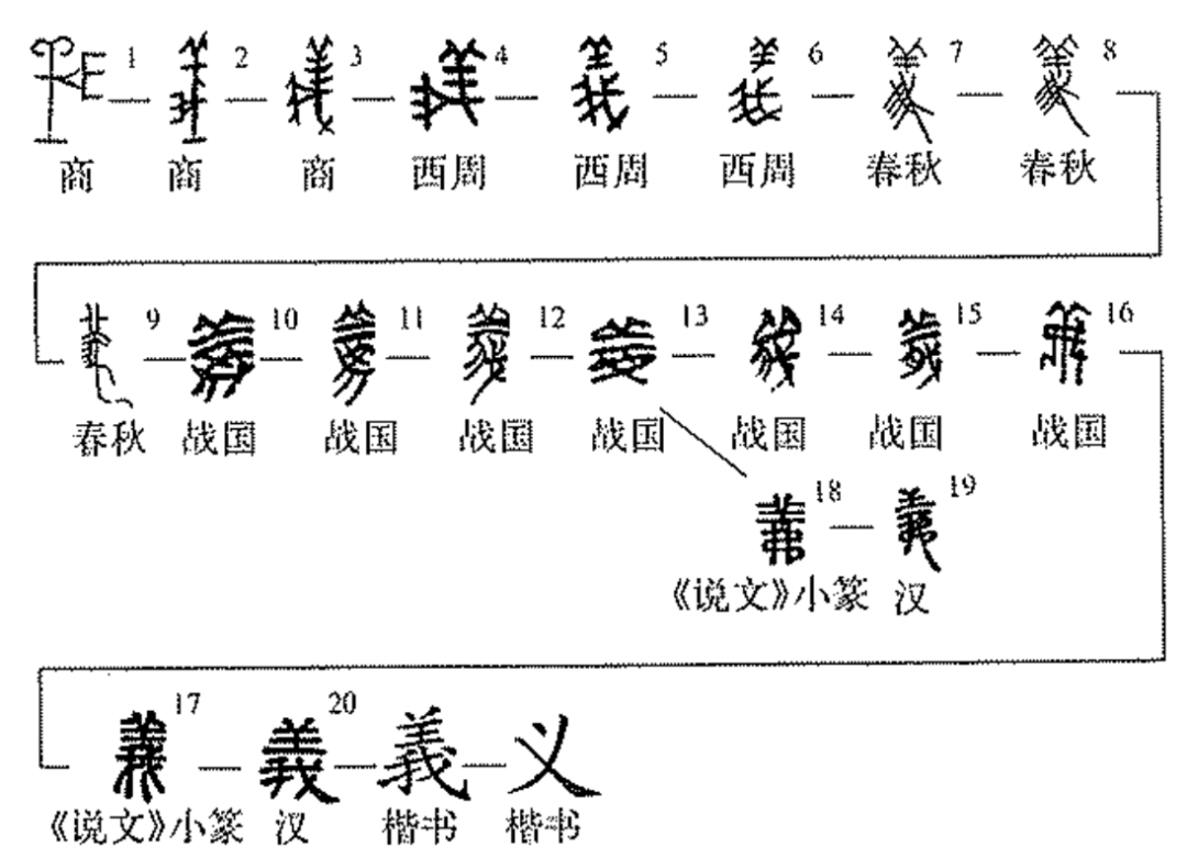 “義”是“儀”的本字。義,甲骨文(羊,即“祥”的本字,祭祀占卜显示的吉兆)(我,王者之器,为王而战),表示吉兆之战。金文、篆文承续甲骨文字形。篆文异体字“羛”(羊,即“祥”的本字,祥和)(弗,休战),表示休战和平,表达“道义”的另一层含义。造字本义:名词,出征前的隆重仪式,祭祀占卜,预测战争凶吉;如果神灵显示吉兆,则表明战争是仁道、公正的,神灵护佑的仁道之战。隶化后楷书‘義’将篆文字形中的“羊”写成“去尾羊”。《汉字简化方案》另造指事字“义”,在“乂”(割、杀)上加一点指事符号,表示杀得有理、杀得正当。当“義”的“仪式”本义消失后,篆文再加“人”另造“儀”代替,表示程式庄严的典礼。“意”,指个人的心思、想法,强调的是个体性和主观性;“義”,原指扬善惩恶的天意,后引申为公认的道德、真理、公认的文字内涵,强调的是普遍性和客观性;“意义”,指个人愿望与世间公理。