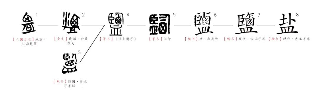 “盐”yán,会意字,“鹽”的简体字。从西周金文的“盐”字可知,造字者的时代已经会使用海水蒸发结晶制盐。“鹵”即指盐粒,造字本义:蒸发结晶制盐,引申为“咸”、“盐”。