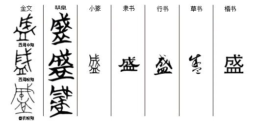 “盛”chéng。会意字,从皿从成。西周金文“盛”=(成,包围、覆盖+皿,盆、碗,两形会意,为把东西放进去,装满容器。“盛”的shèng义应是假借了“晟”义,此处不再赘述。