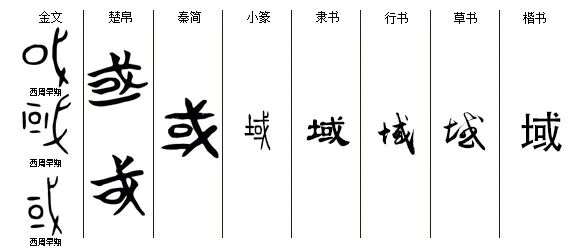 “域”yù,形声字,从土从或。西周金文的“域”=(或,国土+土,与土有关),两形会意,表义当权者统治的地区、疆土。引申为地区、范围、局限等。