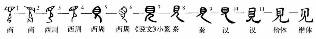 “见”,会意字,“見”的简体字。甲骨文(图1、2)中的见字,下部像一个跪坐的人,上部用一只特别强调的横放的大眼(“目”)来表示平视前方。“见”的本义就是眼睛向前平视。西周早期金文(图3)仍然保持着甲骨文见字的写法。从西周中期金文(图4)开始见字下边所从的人形已经变为形,但上部所从之“目”仍然很象形。到了西周晚期金文中的见字(图5)已经变为与秦汉篆文相近,眼睛变成了斜竖形,人的形体也变成垂手站姿了,《说文解字》小篆见字正是从这一形体而来。以后,汉隶以小篆为基文,进一步将“目”下的人形写作“儿”。由此发展成楷书。汉字简化时又根据草书将“見”简化为“见”。