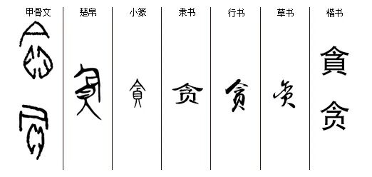 “贪”tān,会意字,“貪”的简体字,从今从贝。“貪”最早见于商代甲骨文。今,王权旨意、意图,引申为王权、一方之主;贝,钱财。两形会意,表义一方之主却还坐拥钱财即为贪,引申为不知足、好物等。