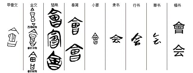 “会”huì,会意字,“會”的简体字,从合从(反)合,中间一点、两点或三点皆为饰笔,最早见于商代甲骨文。合,王权号令,引申为聚集、全部。两形会意,表义两方霸主思想、军事等方面的碰撞。引申为合在一起、沟通、时机、见面、开会、对峙等。