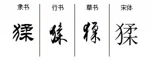 “猱”náo,形声字,“夒”náo的孽乳字,从犭从戎。此字目前只见楷体,因“柔”的楚国文字形似树上的猴,故后人加犭造“猱”,替代书写复杂的“夒”,音义同“夒”,泛指灵长类动物。