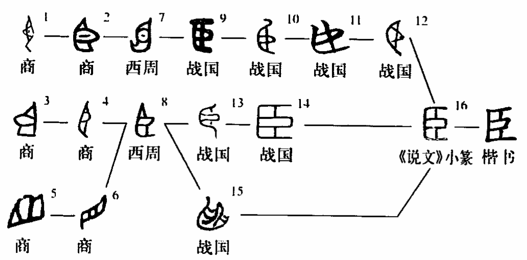 “臣”,指事字。“臣”始见于商代甲骨文(图1-6),绝大多数字形像一只竖立的眼睛。“臣”本义指奴仆,奴仆服侍主人时,通常是俯首帖耳,不敢正视主人,因此用竖立的眼睛来代指奴仆。“臣”在甲骨文里,多是无眼珠的。发展到金文(图7、8)阶段,中间加了一点表示眼珠。也有一些字形是横向的眼睛,可能取意于负责监督的臣仆(图5、6)。臣或正写,或反写,表意相同。西周继承了商代结构,只是横写的消失。战国时象形性弱化,线条化加强,大都带有潦草的隶意,如图9的眼珠被穿透,图10的平直眼眶带了钩,图11的眼眶缺少约四分之一,图12的圆眼珠变成三角形尖眼珠,图13的眼球已变成狭长的圆柱体,图15被繁化得失去所象,只有峄山刻石(图14)端庄方正,象形得体,隶意亦存,被《说文解字》收取为标准。于是以这一形体为基文,发展成隶书和楷书。
