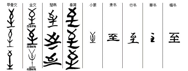 “至”zhì,象形字。“至”字最早见于商代甲骨文,粟穗成熟后垂向地面的象形描绘,顶部符号为‘粟穗反向’,中间符号为‘向下的箭头’,底部符号为‘土’。造字本义:粟穗成熟垂向地面,粟穗成熟引申为‘极、最’,如最好、最高、最大;垂向地面引申为‘向…某处、到来’;植物粟弯曲垂向地面而不断又引申为‘甚(至)’;粟穗垂向地面,又引申为‘反向’;粟穗成熟垂向地面又引申为‘成熟后的某一阶段’。