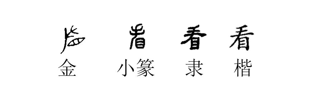 “看”,会意字。《说文》分析为“从手下目”。篆文=(一个人抻出手)+(目,用眼观察),表示举手遮光,远眺观察。有的篆文简化。有的篆文=(倝,战旗)+(目,观察),表示将领远眺观察。造字本义:举手遮光,远眺侦察。《说文》本义是“睎”,即以目视物。《乐府诗集·横吹曲辞五·十五从军征》:“遥看是君家,松柏冢累累。”引申指看望。《韩非子·外储说左下》:“梁车为邺令,其姊往看之。”引申指估量。《三国志·吴书·周鲂传》:“看伺空隙,欲复为乱。”以上读kàn。引申指照看,看管。北魏贾思勰《齐民要术·养羊》:“或劳戏不看,则有狼犬之害。”以上读kān。