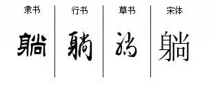 “躺”tǎng,形声字,从尚从身。“躺”字目前只见楷体。尚,本义为‘会客场所’,此处继承了“敞”的引申义‘展开、摊开’;身,人的身体,引申为‘各种物件的本身’。造字本义:身体摊开。引申为‘物件摊开、展开’等。