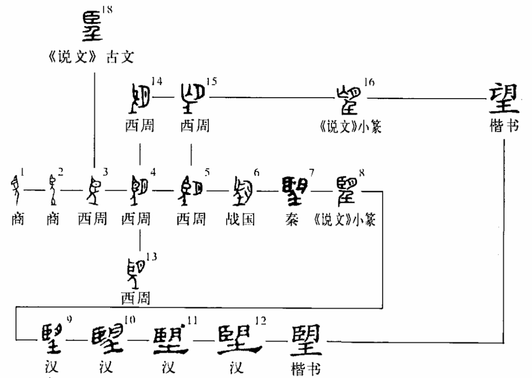 后来,“朢”的形体中像目的部分或讹变为“耳”(图13),或出现一种讹近“亡”的写法(图14):竖眼(“臣”)不见了,以“亡”(本是眼睛被刺破了眼珠子的形象)代替“目”作为声符,而且将“月”变成“夕”(“夕”的古文是“月”中无点,本是月亮初升的形象)。这一来,这个字就变为形声字了。在这讹变的基础上,便干脆将这部分写作“亡”(图15),以之提示字的读音,因而又有了“望”字,成为“朢”的异体。再到后来,人们又采用异体字分工方式,以“望”字专门表示张望、瞭望、远望之望。而以“朢”字专门表示朔朢之朢。汉字简化,朔朢之朢、张朢、远朢、瞭朢之朢统一作“望”。
