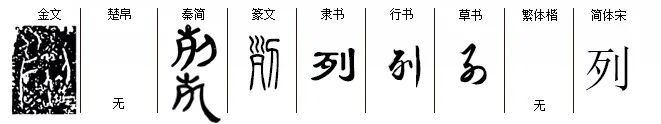 “列”liè,形声字,从歹从刂,“列”字最早见于西周金文。歹,艮卦,引申义为群山;刂,用刀切。造字本义:像刀切后一段段的群山,由‘一段段的群山’引申为‘众多、举例’等义;由‘一段段’引申为量词,‘一列’;由‘一段段’也引申为分段,后造“裂”字,表义分段。