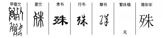 “殊”shū,会意字,“殊”字最早见于商代甲骨文。甲骨文的“殊”字有两款。一款由象形字‘鼄’和象意字‘死’构成,另一款由‘鼄’、‘歹’、‘女’构成。‘鼄’即指‘蜘蛛’,在古代指祥瑞、喜事;‘歹’、‘女’和‘歹’、‘人’皆指人走‘歹运’了。两形会意,人要走霉运(歹)了,却又来好运(蛛)了,或相反,造字本义:转危为安;得而复失。由或好或坏引申为‘不同、特别、特异’;由极好或极坏引申为‘很、甚’。