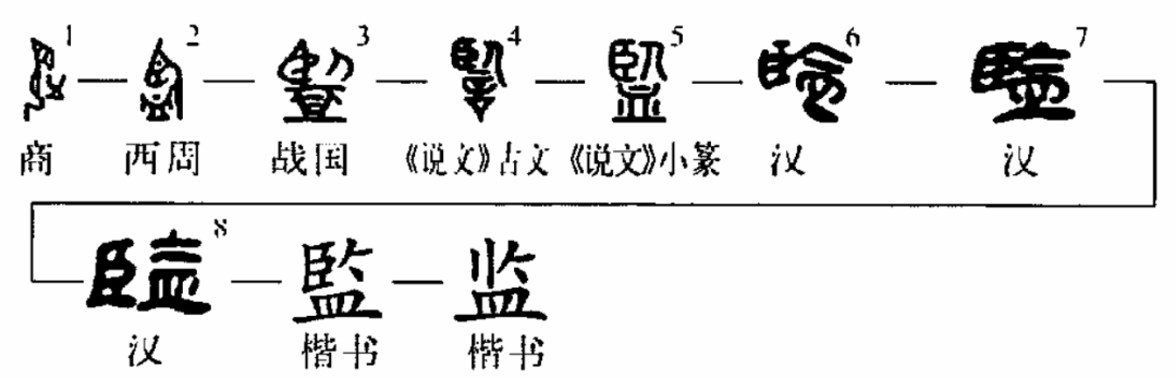 “监”,会意字。在甲骨文(图1)中,“监”正像一人跪或立在盛水的器皿里照脸。西周金文(图2)承袭甲骨文,皿中增一点,代表的是照容的水。发展至战国,分裂之状已甚明显:人的眼睛与身体分开,眼睛部分变为“臣”字;皿中也大都有水(图3)。这几个字不如甲骨文形象、生动,但临水窥影之状还绰约可见。不过,字形演变到小篆(图5),人和眼睛断然分离为二,照容之意遂晦而不显,许慎也因此把它归入卧部。隶书(图6、7)把人和盘上的一点水都缩到“皿”的右上方去了;并由此发展为楷书,又根据唐代的草书简化为“监”。后来因为“监”多表示监督、监视,故加“金”为意符,造“鉴”字来表示本义。