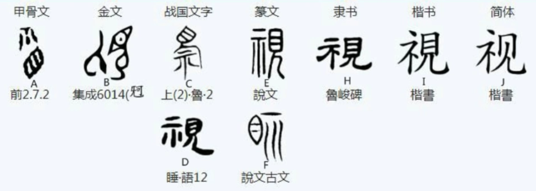 “视”,形声兼会意字。甲骨文上像“示”,下像“目”(图A)。示,既是声旁也是形旁,表示祭告。甲骨文=(示,祭告)+ (目,看),造字本义:向神祭告时仔细察看显示的征兆。金文调整成左右结构,并将“目”写成"见"。籀文写成目、示会义,表示察看征兆。金文调整成左右结构,左像“示”,右并将“目”写成“见”(图B)。籀文写成目、示会义,表示察看征兆。战国文字一个上“见”下“示”(图C);另一个左“示”右“见”(图D)。篆文承续金文字形。从见、示声(图E、F、G)。从“见”,表示观察;“示”表示音读,也兼表显示的意思。在六书中属于形声兼会意。《说文》又收有二个古文形体,一个是从目、示声;另一个是从目、氐声。隶书(图H)、楷书(图I)从战国文字、篆文来。
