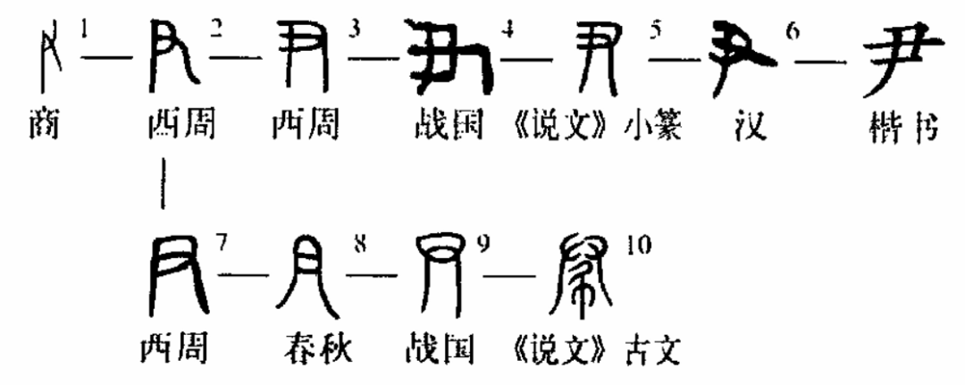 “尹yǐn”,这是一个会意字。甲骨文的“尹”字,像手持权杖之形,表示拥有一定指挥权力的职官。也可视作手执刻刀,表示拥有文书、占卜权力的贞人(贞人即卜官。在殷人的占卜活动中,是由贞人向鬼神贞问殷王需要决疑的事项。)。金文的“尹”字与甲骨文相似,到了小篆时,手中的权杖之形已向下延伸;楷书则演变为长竖,将手腕缩短于手形之中,写作“尹”。