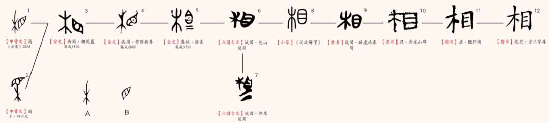 “相”,会意字。“相”字早见于甲骨文,其形体为“图1”或“图2”,早期结构并不固定,或作上下结构,或作左右结构。金文为图3-图5。金文的形体与甲骨文的前一“相”字相近,只是金文的笔画变粗了些。金文目下或以“二”为饰笔(图5)。不论是甲骨文还是金文,其结构均由“木”和“目”构成,其中的“图A”就是今之树木。“图B”为人的眼睛,外边的轮廓像眼眶,里面像瞳孔,即今之“目”的象形字,此处表示看的意思。学者们根据“相”字的结构,将其最初意义理解为看树木。由此可以得知,“相”字的构形,透露了先民喜欢树木的心理,同时也说明他们是一些爱看树的人。在他们看来,大地上的树木最值得看,而且百看不厌。许慎用“省视”来训释“相”,正体现了先民的这种心理。“相”作“细看”“认真看”的意思是从“看树木“的初义引申出来的。