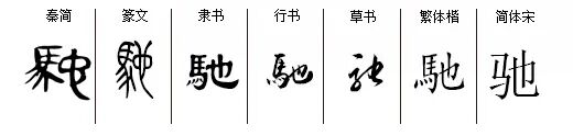 “驰”chí,秦简中的字形为从马从矛,本义为车马像飞矛一样疾行,而《说文》小篆中讹变为从马从也,自此开始以讹传讹,致使如今我们看到了错误的‘驰’字。