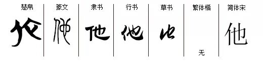“他”tā,形声字,从亻从也,本字作“佗”,“他”字目前只见于楚国包山楚简。人,与人有关;‘也’通‘它’,引用‘它’的‘人以外的事物’义,造字本义:他人,后专指你、我以外的第三人,一般指男性,有时泛指,不分性别。