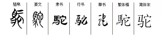 “驼”tuó,形声字,“駝”的简体字,从馬从它,本作‘佗’,通‘佗、坨’,“驼”字目前只见于楚国包山楚简。马,与马有关;它,本义蛇,此处引用佗的‘驼背、负荷、重担’义,造字本义:一种与马相似、身体背部成拱形的动物即骆驼,继承‘佗’的‘驼背、负荷、重担’等义。