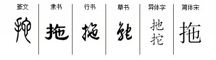 “拖”tuō,形声字,通‘扡、拕’,从扌从㐌,“拖”字目前只见于《说文》小篆。扌,与手有关;它,本义蛇,此处引用佗的‘负荷、重担’义,造字本义:手负重,引申为‘牵制、下垂、负担、抢夺、费力’等。