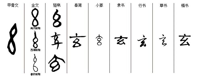 “玄”xuán,指事字,悬的本字,“玄”字最早见于西周金文。金文是一束丝的样子,丝在染色的时候扎成束,然后晾晒,晾晒时要悬挂起来。西周晚期时,字形上部追加圆点状饰笔符号以修饰,楚秦再线化为一横。隶书笔划化,上边变成‘亠’(tóu)。造字本义:糸(丝)悬挂,由‘悬挂’引申为‘动荡不定’,又引申为空中、天空。也指无从下手,在逻辑上具有一定的模糊性、隐晦性,所以“玄”又引申为‘幽远’;也可引申为‘奥妙’。