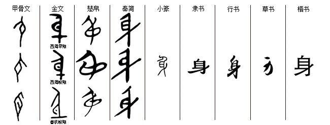 “身”shēn,象形字,“身”字最早见于商代甲骨文。甲骨文的“身”字像人的侧面身躯之形,写法上突出腹部,是因为腹部是身躯的主要部分;西周金文的“身”字底部加一横,旨在表达此字所指为腿以上的部位;楚帛文字或与甲骨文“身”字相同,或与西周金文相同;秦文字“身”字笔划化;《说文》小篆将底部一横变换成像人腿一样,至此“身”字定型。造字本义:人的(颈以下,腿以上)躯干,有的甲骨文字形中腹部中间加一笔,或有身重、怀孕之义,如‘身孕’;由‘人身’引申为所有物件的‘躯干’;也引申为‘人的生命’,如身世、献身等;也引申为‘亲自、本人’,如‘自身、亲身’等。