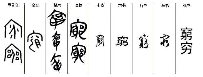 “穷”qióng,甲骨文时期为象意字,西周之后变为会意字,‘窮’的简体字,‘窮’字最早见于商代甲骨文。甲骨文的‘窮’字像人居住在洞穴,身体被迫弯曲、不自由。西周金文中的‘窮’字具象了字形,‘穴’和‘躳’会以人在洞穴内身体弯曲之义。楚系简帛中的“窮”字笔划化,使字形逐渐清晰可辨。从秦隶开始方块化,晋代以来的草书中,声符‘躬’被简省笔划,写得与‘力’形近。到了元代,根据‘窮’字草书的写法加以楷化,把‘窮’写作‘穷’。新中国成立后简化汉字时,采用‘穷’作为简体字,而把‘窮’字废弃了,简化字为会意,力在穴下,有劲使不出。造字本义:处境恶劣,引申为‘窘困、极端、贫困’等。