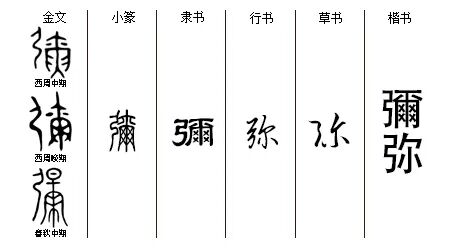 “弥”mí,形声字,通‘弭’,‘彌’的简体字,从弓从爾,‘彌’字最早见于西周金文。弓,与弓有关;爾,络丝机具,此处引用‘收尾、结束’义。造字本义:收弓,引申为‘停止战事’,‘彌’的引申义多继承于‘爾’,如‘收’、‘长’、‘满’、‘结束’等。但也有如‘爾’一样的矛盾义共存,如‘收’和‘满’,这种汉字是古汉语中独具特色的一种现象,一般称为‘正反同词’。